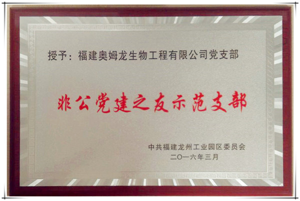 2016年3月30日,中共福建龍州工業(yè)園區(qū)委員會授予福建奧姆龍生物工程有限公司黨支部“非公黨建之友示范支部”榮譽稱號!