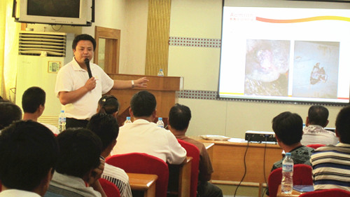 會(huì)議上,技術(shù)總監(jiān)郭金權(quán)講解病情,為養(yǎng)殖戶排憂解惑。