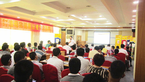 圖1 技術(shù)總監(jiān)郭金權(quán)講解母豬分娩后注意事項(xiàng)