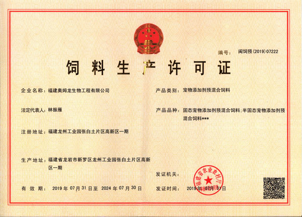 奧姆龍寵物添加劑預(yù)混合飼料車(chē)間取得生產(chǎn)許可證