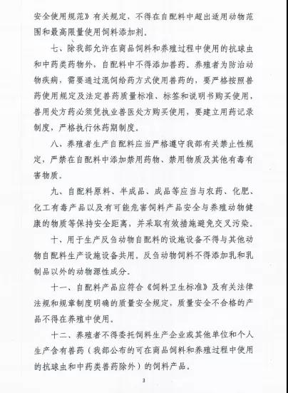 八、養(yǎng)殖者生產(chǎn)自配料應(yīng)當(dāng)嚴(yán)格遵守我部有關(guān)禁止性規(guī)定,嚴(yán)禁在自配料中添加禁用藥物、禁用物質(zhì)及其他有毒有害物質(zhì)。