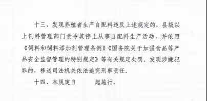 十三、發(fā)現(xiàn)養(yǎng)殖者生產(chǎn)自配料違反上述規(guī)定的,縣級(jí)以上飼料管理部門責(zé)令其停止從事自配料生產(chǎn)活動(dòng),并依照《飼料和飼料添加劑管理?xiàng)l例》《國(guó)務(wù)院關(guān)于加強(qiáng)食品等產(chǎn)品安全監(jiān)督管理的特別規(guī)定》等有關(guān)規(guī)定處罰。發(fā)現(xiàn)涉嫌犯罪的,移送司法機(jī)關(guān)依法追究刑事責(zé)任。