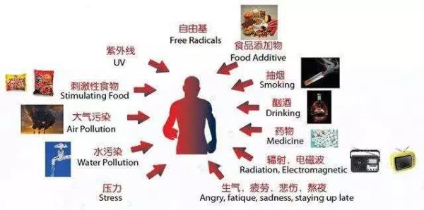 環(huán)境中的輻射、空氣污染、吸煙、農(nóng)殘等都會使人體產(chǎn)生更多活性氧自由基,此外過量運動和重度的精神壓力也會導(dǎo)致自由基數(shù)量明顯上升。