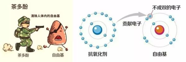茶葉中的茶多酚是由一系列多酚類化合物組成,這些化合物富含氫氧OH基團(羥基),負電荷的離子形式存在使其具有還原性質(zhì)和很強的捕獲自由基的作用。從而消滅或者減少自由基對人體的侵害。
