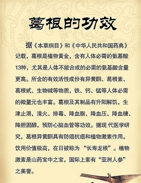 葛根內(nèi)含12%的黃酮類化合物,如葛根素、大豆黃酮苷、花生素等營養(yǎng)成分,還有蛋白質(zhì)、氨基酸、糖、和人體必需的鐵、鈣、銅、硒等礦物質(zhì),是老少皆宜的名貴滋補品,有“千年人參”之美譽。早在漢代張仲景的《傷寒論》中就有“葛根湯”這一著名方劑,至今仍是重要的解表方。《本草正義》謂葛根“最能開發(fā)脾胃清陽之氣”。