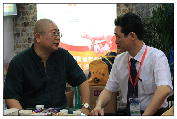 董事長(zhǎng)林振雁(右)與中國(guó)畜牧獸醫(yī)學(xué)會(huì)副秘書(shū)長(zhǎng)夏有彩在會(huì)場(chǎng)交流