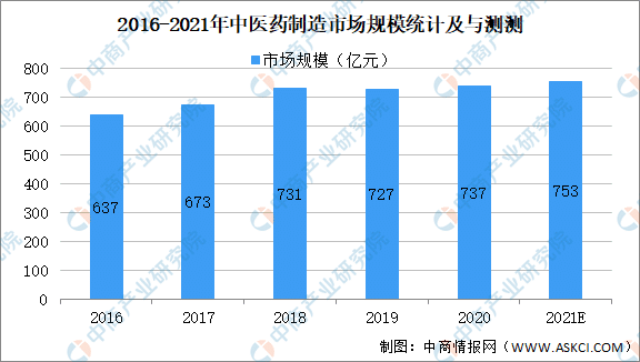 中國是僅次于美國的全球第二大制藥市場。其中,我國中醫(yī)藥制造市場從2016年637億元增至2020年737億元,年均復合增長率為3.7%。中商產(chǎn)業(yè)研究院預測,2021年我國中藥制藥市場規(guī)模將達到753億元,呈上升趨勢。