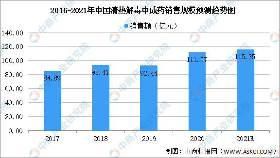 清熱解毒為中醫(yī)名詞,清熱解毒類藥物早己被臨床證實確有抗菌的功效,加之其毒副作用較小,被廣泛應用于呼吸系統(tǒng)疾病及消化系統(tǒng)疾病的治療,在臨床使用中長期占據(jù)著較為重要的地位。數(shù)據(jù)顯示,2019年中國城市零售藥店終端中成藥清熱解毒用藥銷售額超過92億元,同比下滑1.03%。預計2021年我國城市零售藥店終端中成藥清熱解毒用藥銷售額將達115.35億元。