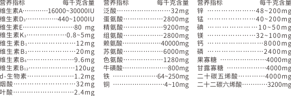 【原料組成】賴氨酸、蛋氨酸、精氨酸、亮氨酸、組氨酸、色氨酸、?;撬?、雞肉粉、魚粉、深海魚油、椰子油、亞麻籽油、復(fù)合維生素、常量礦物質(zhì)元素、復(fù)合微量元素、果寡糖、純化水等。