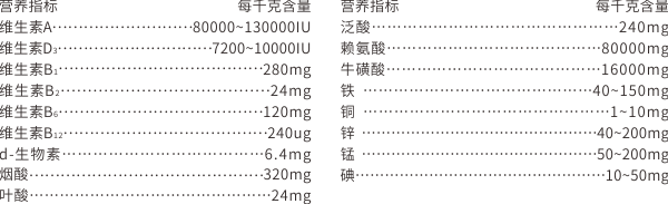 【原料組成】賴氨酸、?;撬?、復(fù)合維生素、復(fù)合微量元素、純化水等。
