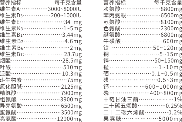 【原料組成 】11種必需氨基酸、?;撬?、甘油三酯(油脂)、Ω-3(亞麻酸+ EPA+ DHA)、復(fù)合維生素、復(fù)合微量元素、果寡糖、雞肉粉和奶粉(載體)等。