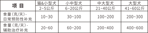 本品可調(diào)成糊狀單獨飼喂或和主糧上拌喂,推薦劑量為體重的0.5%(日常預(yù)防性補充)~1.0%(輔助治療補充)(或按照食量推薦表)。