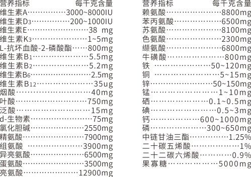 【原料組成 】12種必需氨基酸、甘露糖、L-抗壞血酸-2-磷酸酯、中鏈脂肪酸(MCT)、Ω-3(亞麻酸+ EPA+ DHA)、復(fù)合維生素、復(fù)合微量元素、果寡糖、雞肉粉和奶粉(載體)等。